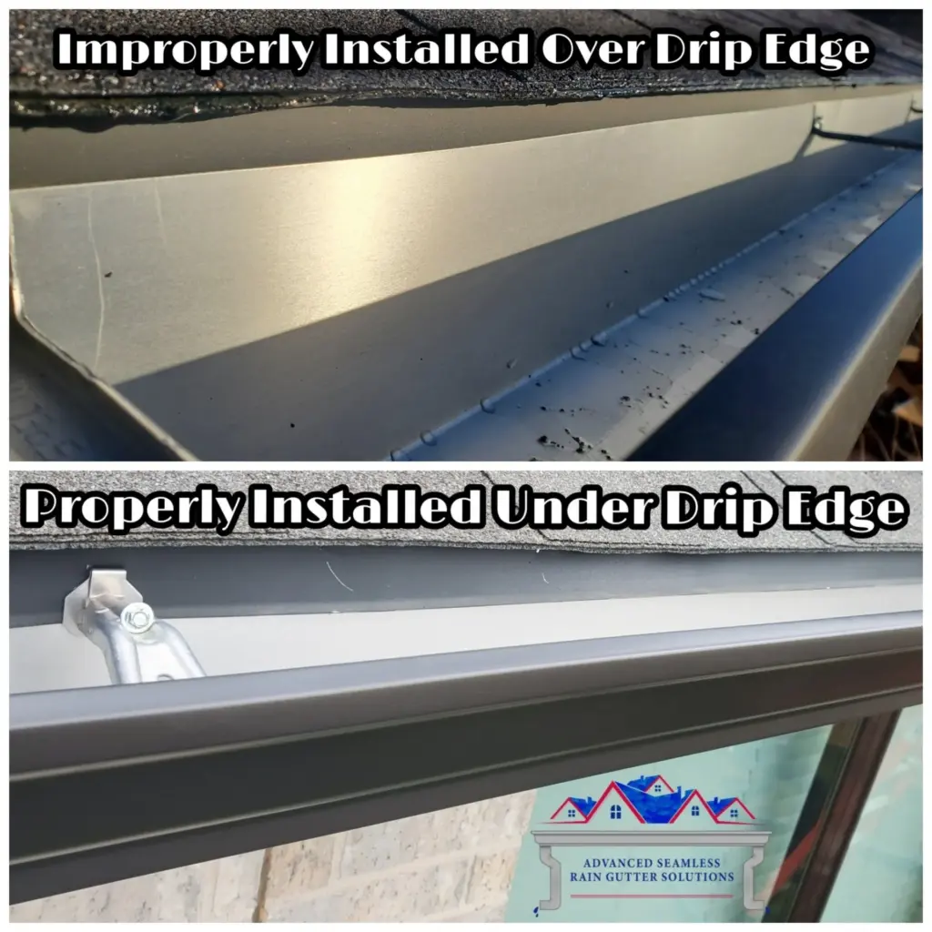 Having a drip edge installed on your roof’s fascia board before installing rain gutters is a really important step. A drip edge is the first line of defense against rain water from getting behind your fascia boards and causing damage to the wall between your home’s exterior and interior walls. Drip edges are basically drip lines that extend about 12 inches or so down each side of the roof, just below the roof’s shingles. As you can see in this picture, a drip edge catches rainwater that runs off of your roof and gently guides it into the rain gutter system to drain properly out through your gutter systems downspouts.